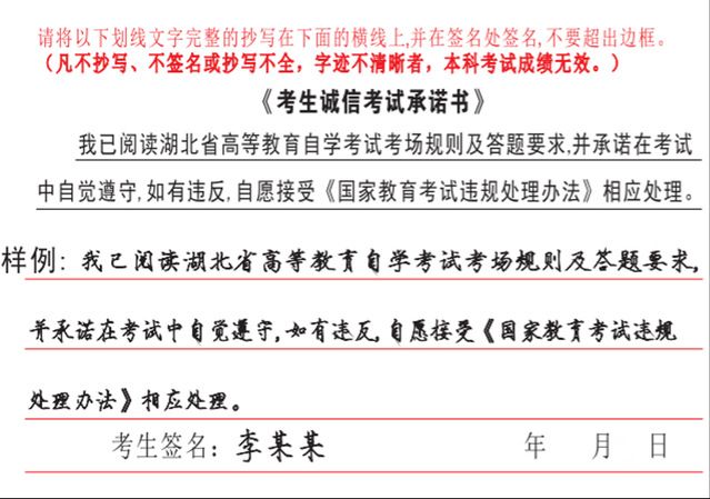 1.落实笔迹信息采集要求。考生应在答题卡指定区域完整抄写《考生诚信考试承诺书》(抄写样例如下图),凡不抄写、不签名或抄写不全,字迹不清晰者,该科考试成绩无效。毕业时省教育考试院将对每张答题卡上的《考生诚信考试承诺书》笔迹进行复核,凡笔迹不一致、经鉴定为代考的,将根据《国家教育考试违规处理办法》作出成绩作废、延迟毕业、记入国家教育考试诚信档案等处理。