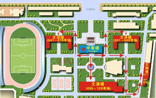 3.考生完成手机存放后,根据手机存放点出口处(中南楼一楼大厅南门)的楼栋考点示意图前往各楼栋考点核验身份信息后参加考试。
